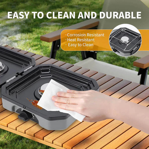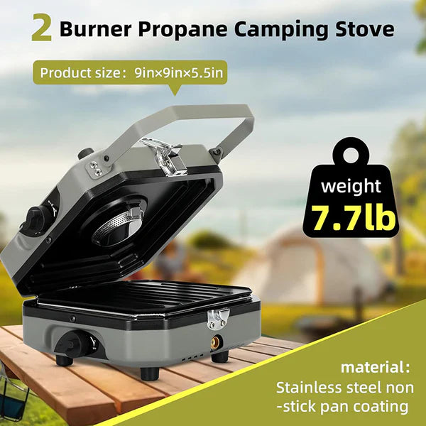 Take your outdoor meals to the next level with iToolMax 2-Burner Foldable Propane Camping Stove! Compact, lightweight, and easy to set up, this powerhouse delivers reliable heat and even cooking—wherever the trail takes you. Folds flat for easy packing, yet unfolds into a rugged, wind-resistant cooking station. Perfect for outdoor camping, tailgating, or backyard BBQs.