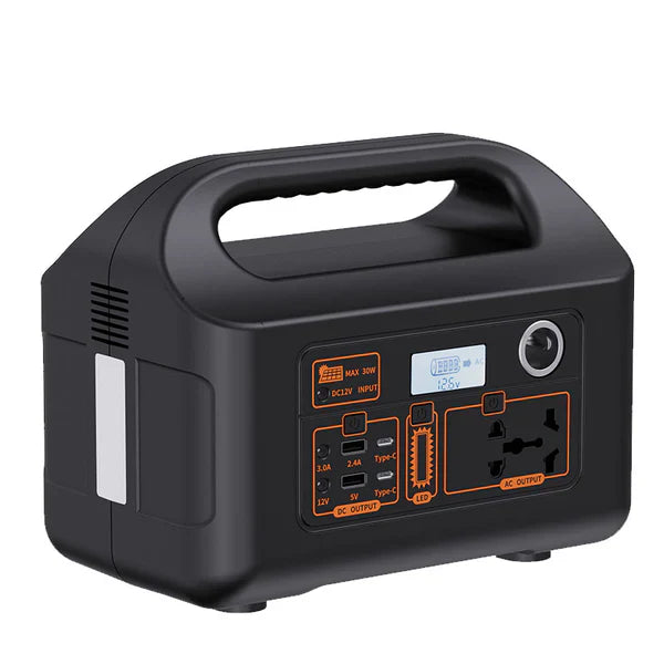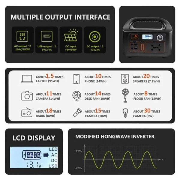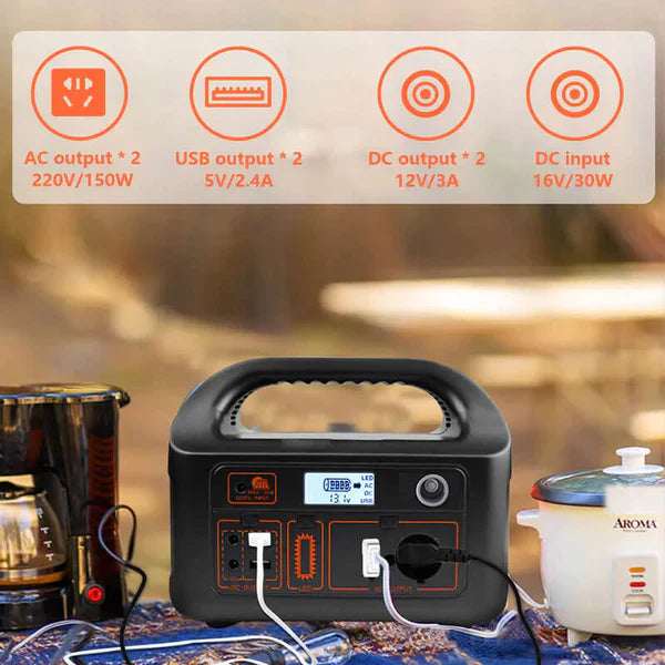 Built-in 30000mAh, 333Wh capacity battery. This portable outdoor power bank features 2 USB ports (5V 2.4A), 2 Type-C ports (12V 3.0A), 2 DC 12.6V3A charging ports and 2 AC outlets (max 150W) and a car charging interface, allowing you to charge up to 8 devices at a time.